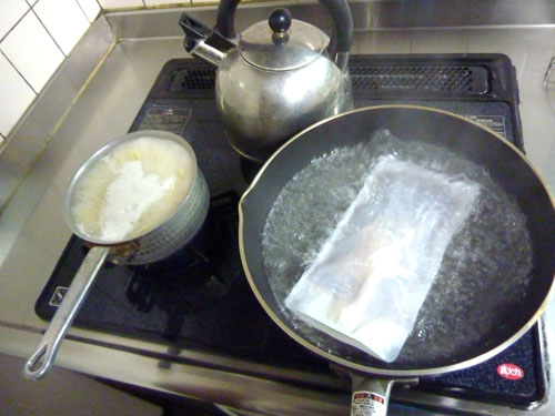 フライパンを使ったりして茹でます。